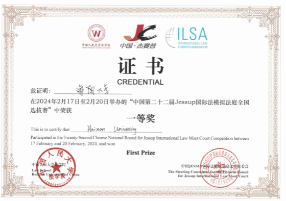 (图一 本届Jessup竞赛获奖证书以及一等奖获奖院校名单)