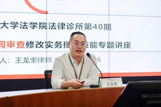 在参观完律师事务所后,海南省律师协会副会长、国浩律师(海南)事务所管理合伙人、管委会主任、法律诊所兼职教授王龙奎律师为诊所师生作关于“民商事合同审查修改实务操作技能”的专题讲座。