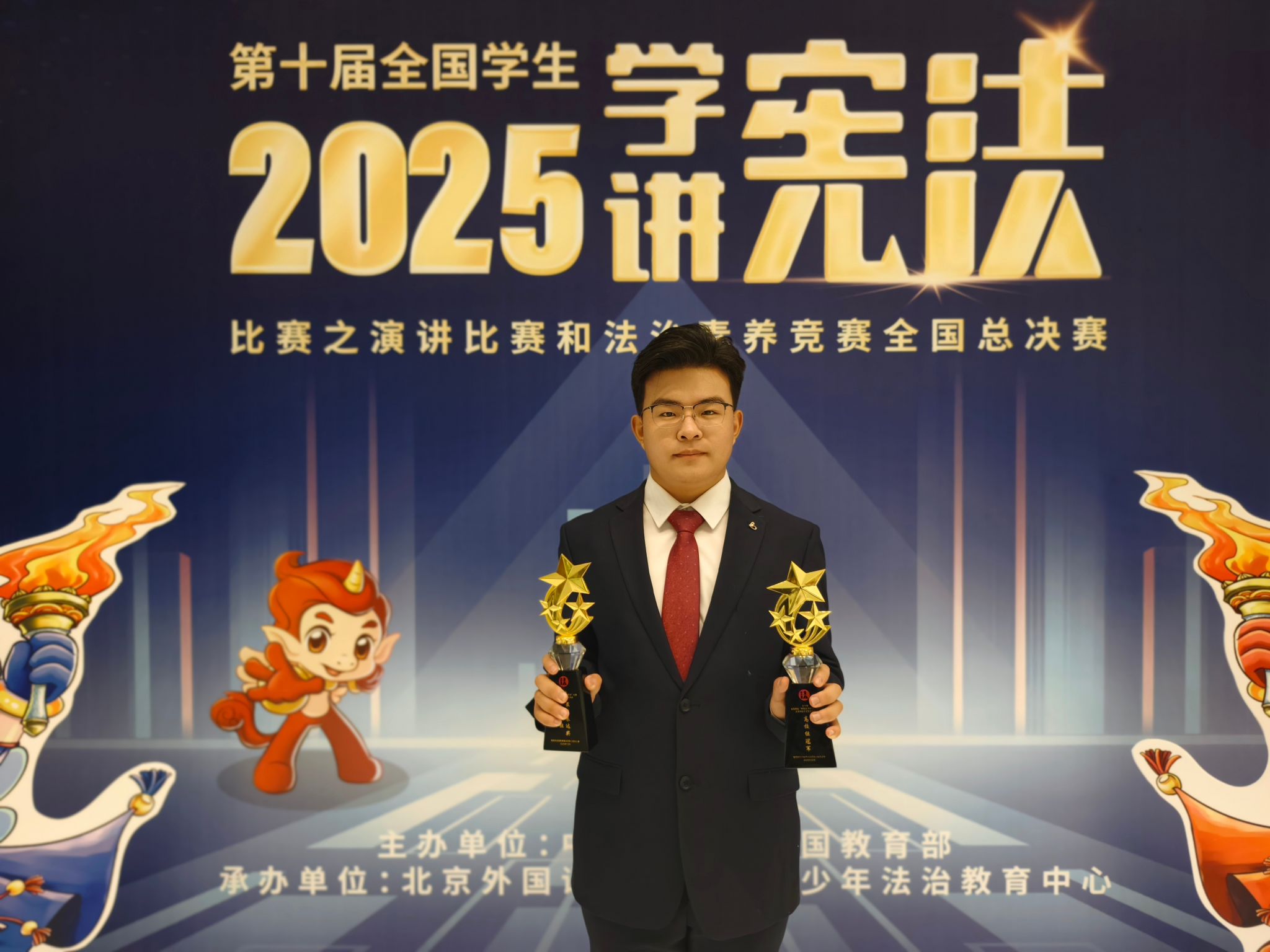 根据《教育部办公厅关于举办第十届全国员工“学宪法 讲宪法”活动的通知》(教政法厅函〔2025〕3号)等有关文件通知,第十届全国员工“学宪法 讲宪法”比赛之演讲比赛与法治素养竞赛全国总决赛于2025年11月29日至12月3日在北京举行。公司学子表现出色,连创佳绩:2024级国际法专业本科生崔子恒凭借扎实的宪法素养与出色的现场发挥,荣获演讲比赛高校组冠军及“最佳表达奖”;2023级法学专业本科生许苗与海南省中小员工代表联合组队,团结协作,沉着应对,在法治素养竞赛中斩获全国一等奖。