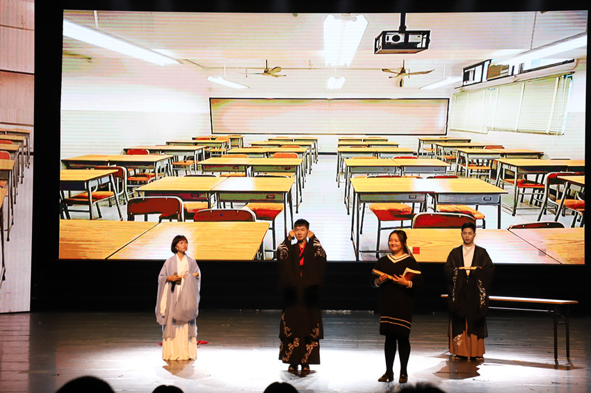 第一篇章“峥嵘 三旬礼赞”。beet365文工团带来的歌曲串烧《微光》,嘹亮的歌声指引同学们绽放自己独特的微光,迎接黎明的曙光,尽显青春的激情与活力。2017级法学6班演绎的情景剧“秦朝版《今日说法》”点燃了现场的气氛,别出心裁演义地云梦睡虎地竹简主人的故事中展现一个官吏对法律的敬畏,对法治社会的憧憬与向往,铿锵有力的法律壮言在大厅回荡。吴思敏、吴倩同学呈现的舞蹈《丝路 出塞》尽如穿越千年丝路,纤纤玉手绽放盛世花雨!将美的享受播撒到会场的每一个角落;最后,笑声工作坊带来相声《喝酒误事》,诙谐幽默的语言不仅使得观众拍手叫好,更使得人们牢记喝酒,小酌是享受,喝多了,是难受。