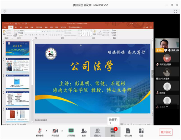 3月9日上午9:45分开始的《公司法学》教学,是本门课程的第一次讲授,为了更准确的了解员工需求,明确告知员工学习的要求以及超星平台的使用方式,课程的讲授方式,也为了增加与员工的互动。在了解和使用了多个教学平台之后,选中了“腾讯会议”进行直播。“腾讯会议”直播对于网速要求不高,能够实时互动,教师不仅可以要求员工发言,员工还能够在听课过程中运用聊天功能随时向教师提问,教师可以及时反馈,帮助员工解决学习问题。