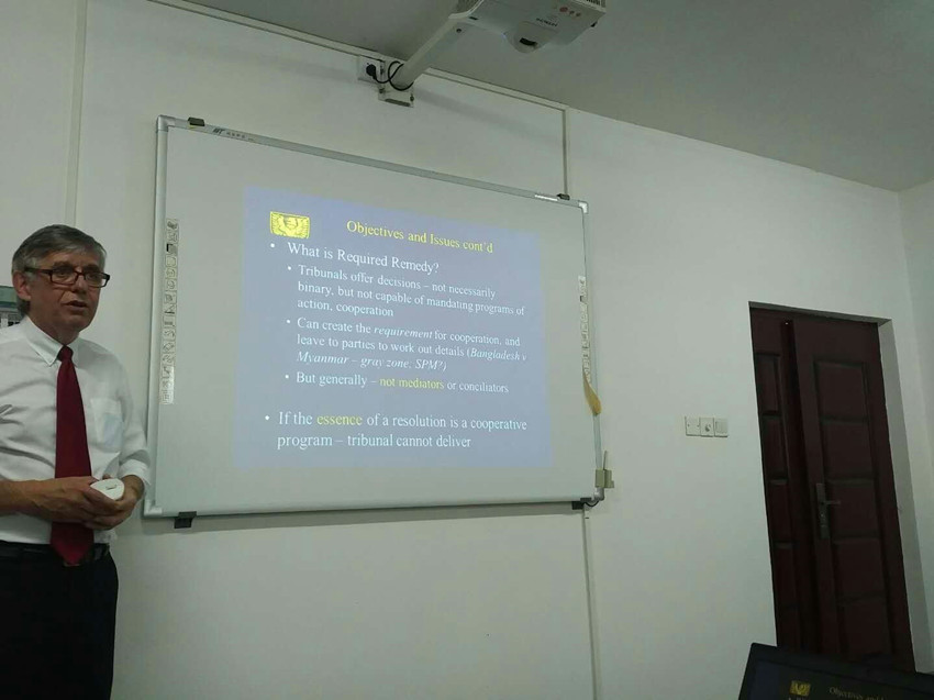 11月10日下午3点30分,加拿大Dalhousie大学beet365的前任经理Philip Saunders教授来本院演讲,加拿大Dalhousie大学是加拿大的海洋法研究重镇,也是本院特聘经理高之国法官的母校。Philip Saunders教授为加拿大最具权威的国际海洋法学者,也曾经受托在国际法院担任律师,学术修养与实务经验兼具。Philip Saunders教授演讲的题目是“1982年联合国海洋法公约的争端解决机制,兼论中菲南海仲裁案裁决蕴含的法律问题”。在2个小时的演讲中,他阐述南海仲裁案的管辖权裁决如何违反海洋法公约的相关条文。深入浅出,包罗万象。让师生受益匪浅。