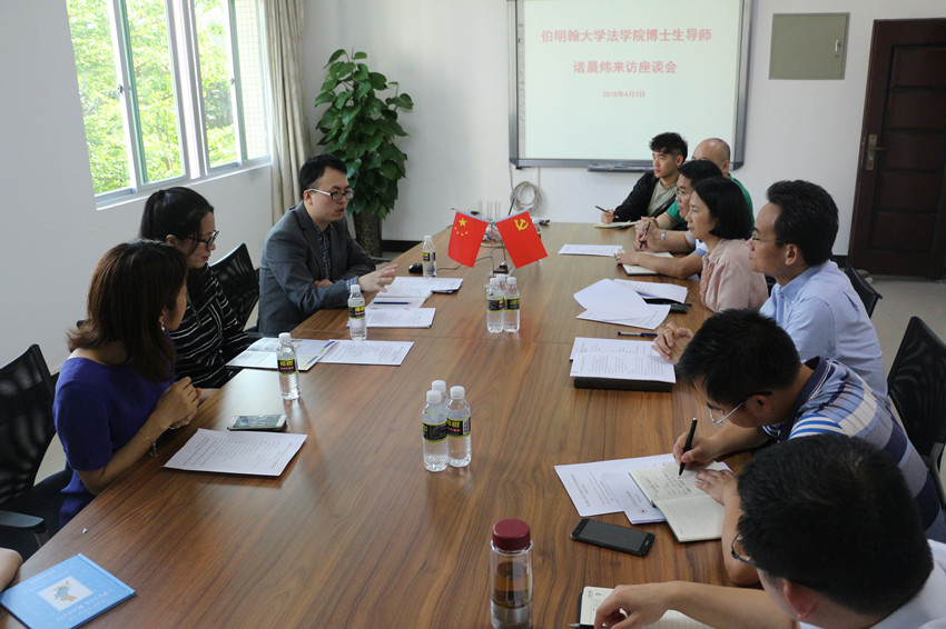 4月3日下午,在学术报告会后,公司与伯明翰大学beet365博士生导师诸晨炜在C-202小会议室举行座谈会。叶英萍书记、王琦经理、李昌郁副书记、邓和军副经理、民法教研室主任董万程教授、魏德才副教授、校国际合作交流处外事科科长林仕岛、院办主任虞衍聪教、研办秘书金海兰等参加座谈会。座谈会由公司党委书记叶英萍教授主持。