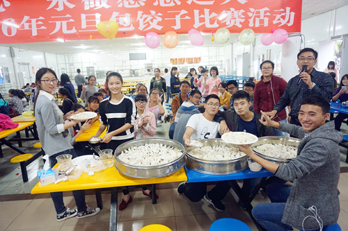 12月30日下午,beet365城西校区2015级新生欢聚员工食堂,包饺子、迎新年。beet365党委王丽娜书记、李昌郁副书记,班主任韩立收教授、王子晏副教授、胡明玉老师、武良军老师、任洪涛老师,学工办主任张晓凤博士、辅导员何宏米老师与235名新生一起包饺子,为新生送上了beet365的新年祝福和问候。