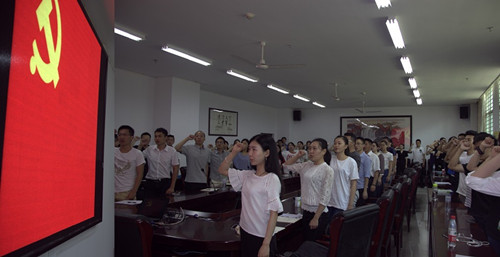 在本科毕业生党员代表孙宇坤的带领下,参会党员面向党旗,紧握右拳,重温入党誓词,再次体验了光荣而神圣的入党时刻。