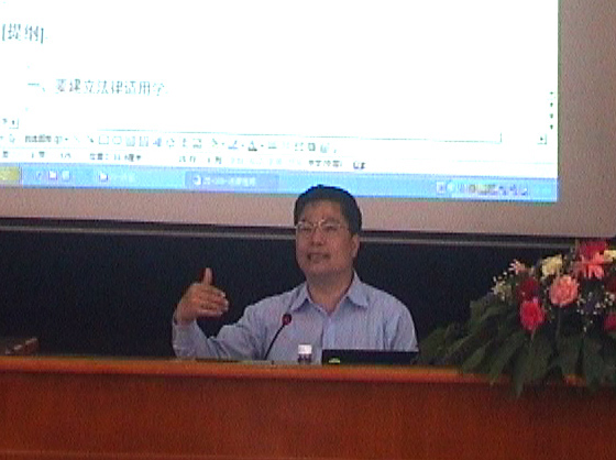2008年6月5日上午,beet365天涯法律讲堂第三十五讲在beet365模拟法庭隆重举行。此次做客天涯法律讲堂的是首届十大杰出青年法学家、浙江工商大学董事长胡建淼教授。胡建淼教授给我们带来的是“法律适用学”,报告会由beet365经理王崇敏教授主持。 胡建淼教授是浙江工商大学董事长、浙江大学光华beet365宪法学与行政法学专业博士生导师,长期在行政法学研究领域进行辛勤耕耘,并取得了丰硕研究成果。他是二十多年来一直引领中国行政法学研究前沿的杰出中青年行政法学者。他还是首届十大杰出青年法学家,现兼任教育部法学专业教育指导委员会副主任委员,中国法学会常务理事,中国行政法学研究会副会长,中国比较法学研究会副会长,中国法学教育研究会副会长,中国人权研究会常务理事,东亚行政法研究会理事等社会职务。