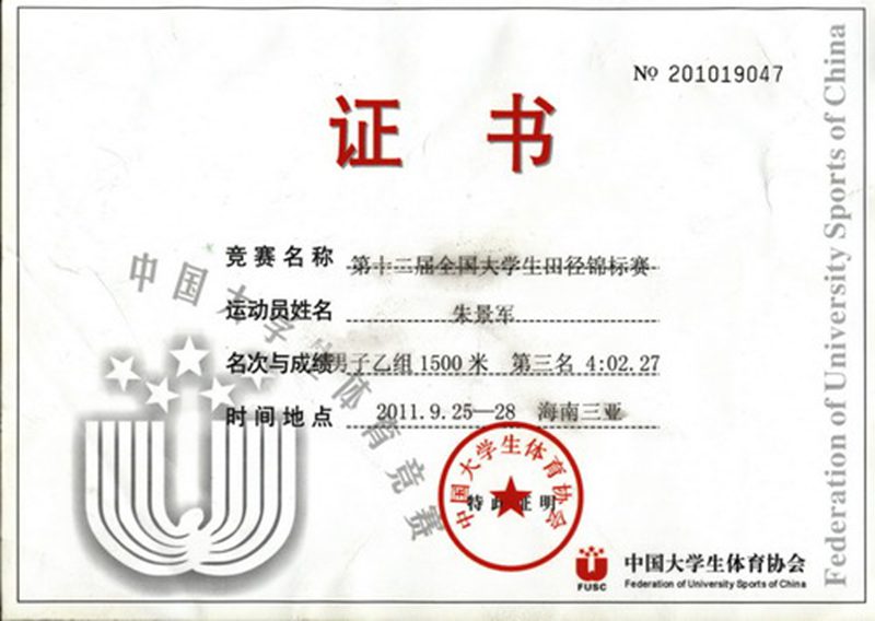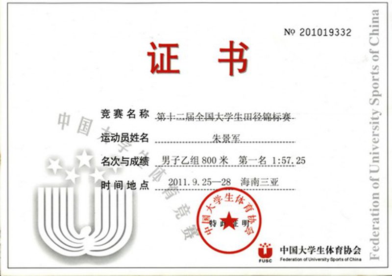 由中国老员工体育协会主办的第十二届全国老员工田径锦标赛于2011年9月25-28日在海南三亚举行,beet3652008级朱景军同学以1:57.25的成绩荣获男子乙组800米第一名,为海南军团摘得首金,并以4:02.27的成绩荣获男子乙组1500米第三名。
