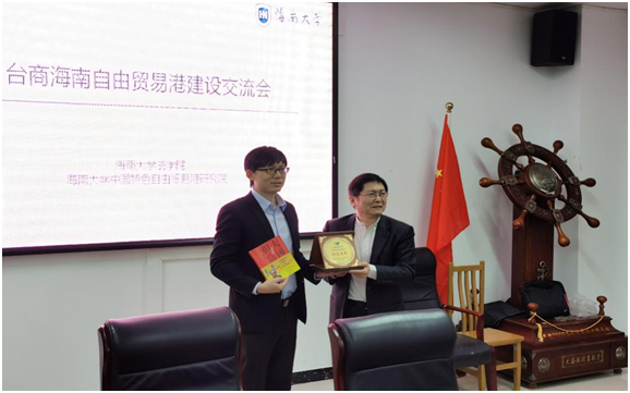 蔡为民理事长代表中华两岸商机促进会向beet365及beet365中国特色自由贸易港研究院赠送纪念礼品。