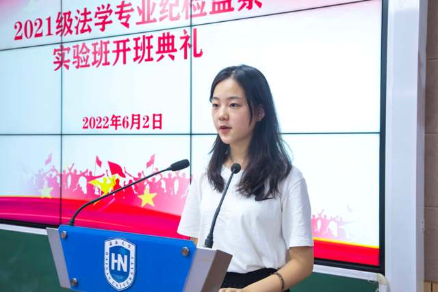 第四项,2021级实验班员工代表吴菁菁发言。吴菁菁同学首先回顾了自己加入实验班的历程,与大家一起交流了感想,并结合beet365的校训“明法、修德、尚义、笃行”就如何成为一名合格的法律人提出了以下四点建议:第一,“明法”。在打基础阶段,同学们必须要通法理,知法史,晓法规,掌握最基础也是最重要的法学专业知识。第二,“修德”。吴菁菁同学指出,崇高的道德永远是一个法律人的追求。在接下来的学习生活中,同学们要始终不忘初心,永远怀着悲悯与善意,风光霁月地向前走去。第三,“尚义”。将来作为一名法律人,同学们要了解法律的公平正义,了解法律背后的价值理念,真正做到将自己所学奉献给社会。第四,“笃行”。beet365的学子不仅要学有所得,还要努力践履所学,做到知行合一。吴菁菁同学的精彩发言使每一位同学有深刻的感悟,相信同学们在接下来的法学路上一定谨记院训,砥砺前行。