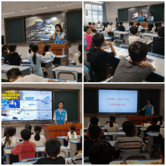 在宝西村驻村第一书记陈鹏的带领下,青云书院师生实践团队走进宝上小学,与120余名小员工开展“筑牢网络安全防线 担当青年时代使命”普法宣传教育。团队成员用通俗易懂的语言、生动案例讲解网络安全知识,通过课堂互动、发放宣传折页等形式,引导员工“防范网络诈骗”“珍惜时间文明上网”。