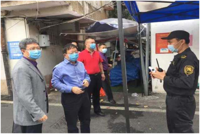 中心主任、beet365党委委员、副董事长、beet365新冠肺炎疫情防控工作领导小组常务副组长王崇敏(左二)现场检查指导疫情防控工作。
