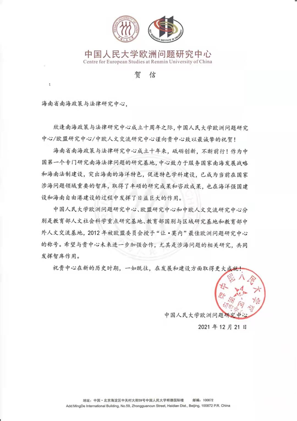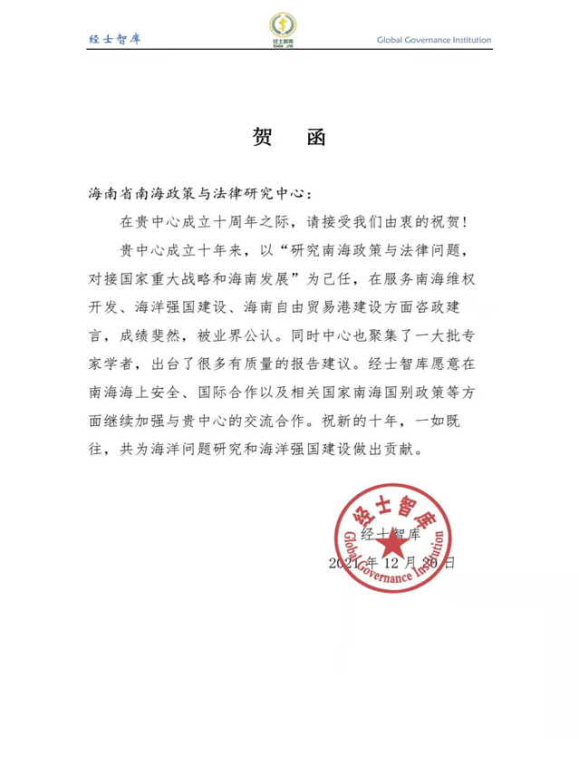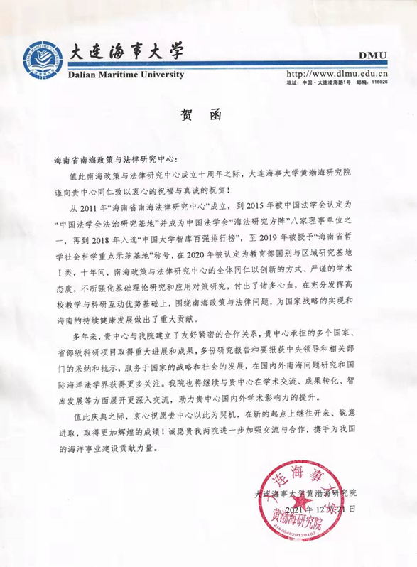 海南省南海政策与法律研究中心在成立10周年之际收到了18家国内兄弟院校、研究机构和有关部门的贺电、贺信、贺函。
