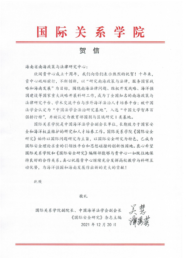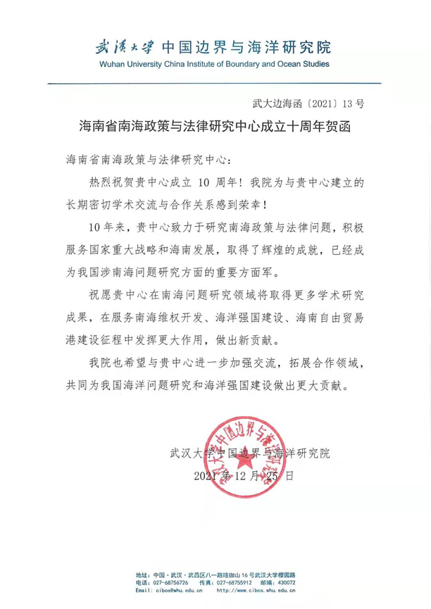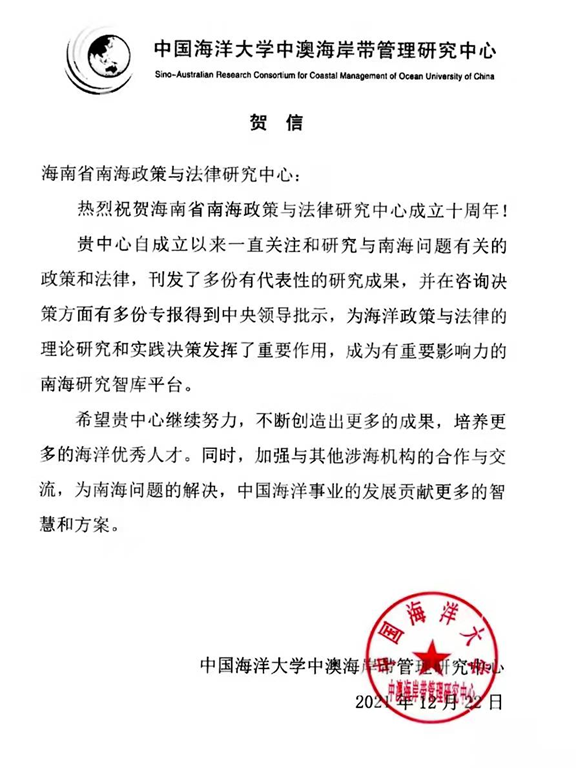 按照收到贺函贺电的时间顺序,有如下单位:上海交通大学日本研究中心、宁波大学beet365、大连海事大学黄渤海研究院、中国海洋大学中澳海岸带管理研究中心、武汉大学中国边界与海洋研究院、经士智库、厦门大学南海研究院、中国海洋法学会、南开大学beet365、南京大学中国南海研究协同创新中心、中国人民大学欧洲问题研究中心、海南师范大学海上丝绸之路研究院、自然资源部海洋发展战略研究所、广西民族大学beet365、国际关系公司、西南政法大学海洋与自然资源法研究所、外交部边界与海洋事务司、中国南海研究院。还有众多院校、机构的负责人向中心转达了祝贺之意。