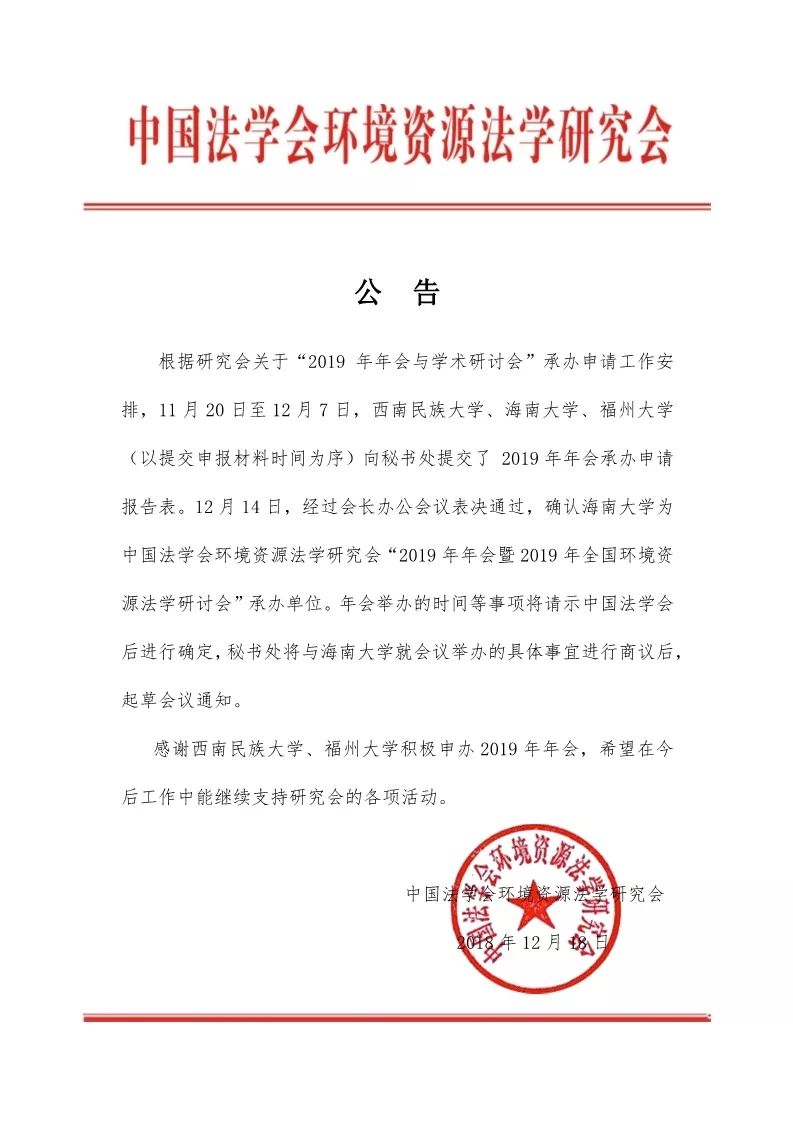 关于中国法学会环境资源法学研究会2019年会暨2019年全国环境资源法学研讨会承办单位的公告